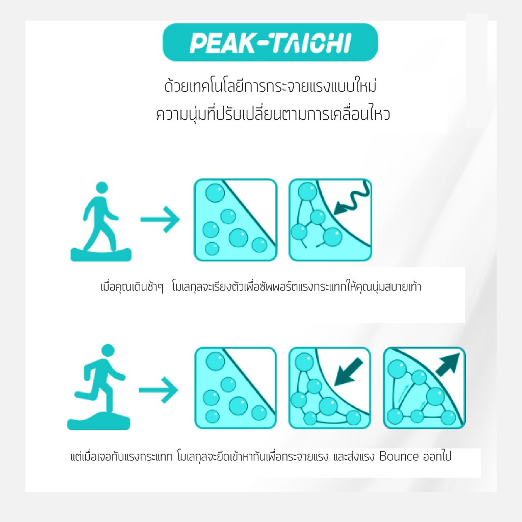 – มีเทคโนโลยีโพลีเมอร์อัจฉริยะ พีค ไทชิ ช่วยดูดซับแรงกระแทก สะท้อนกลับเป็นพลังงาน ช่วยในการเดินส่งตัวให้เร็วขึ้น นุ่ม ป้องกันการบาดเจ็บของเท้าได้ดี เดินได้นุ่มตลอดทั้งวัน