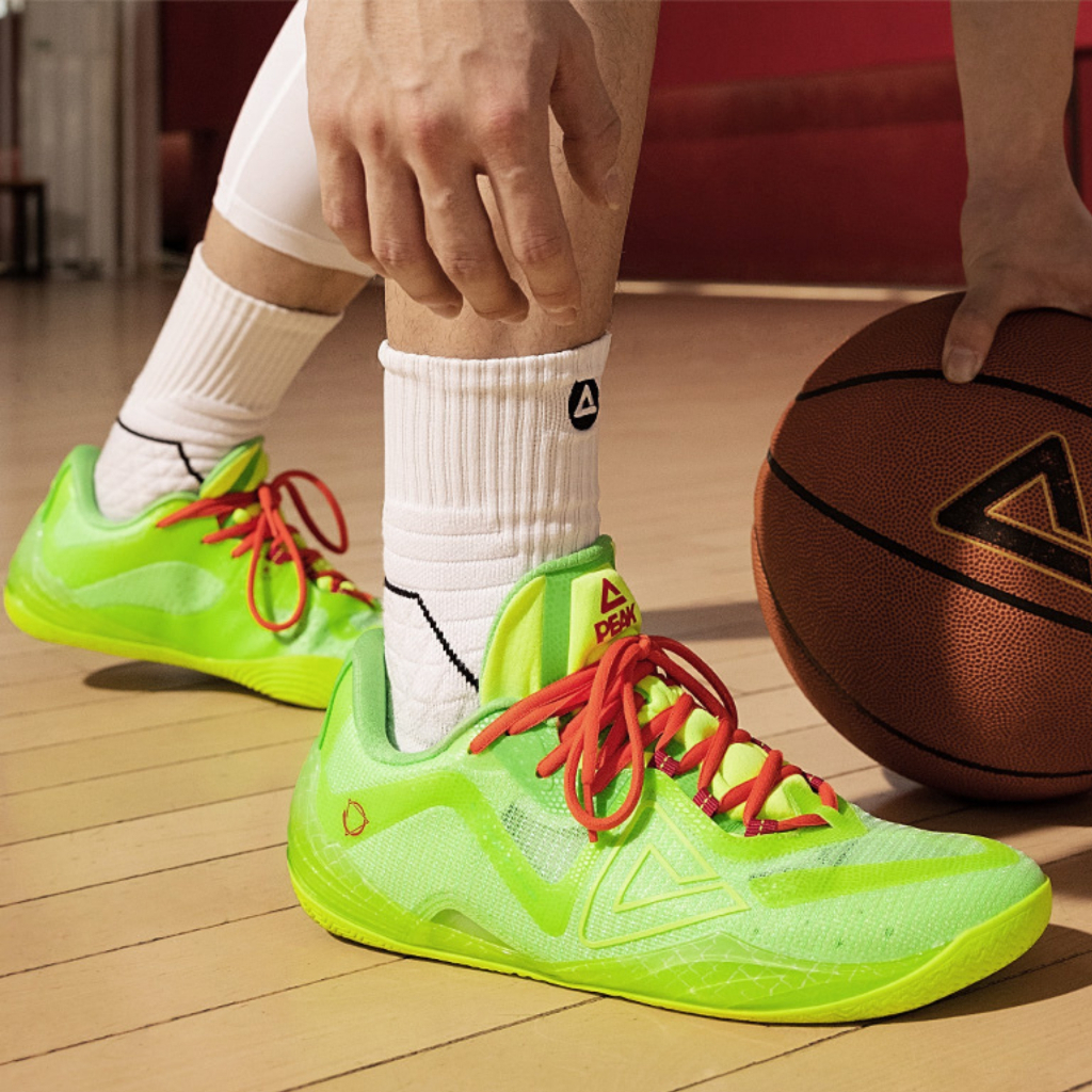 – ด้านนอกเป็นผ้าหนังPUแบบบางเบา ให้การระบายอากาศได้ดี มีโลโก้ PEAK บริเวณลิ้นรองเท้าเสริมฟองน้ำเพื่อป้องกันการแรงกระแทกจากด้านหน้าของข้อเท้า